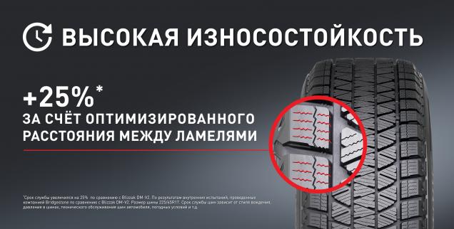 * Срок службы увеличился на 25% по сравнению с Blizzak DM-V2. По результатам внутренних испытаний, проведенных компанией Bridgestone по сравнению с Blizzak DM-V2. Размер шины 225/65R17. Срок службы шин зависит от стиля вождения, давления в шинах, технического обслуживания шин и автомобиля, погодных условий и т.д.
