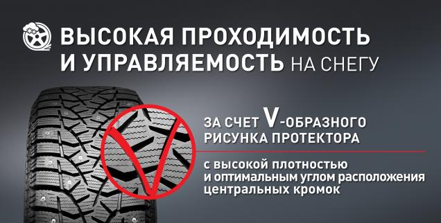 Благодаря особенному V-образному рисунку протектора с высокой плотностью и оптимальным углом расположения центральных кромок увеличивается проходимость в глубоком снегу.